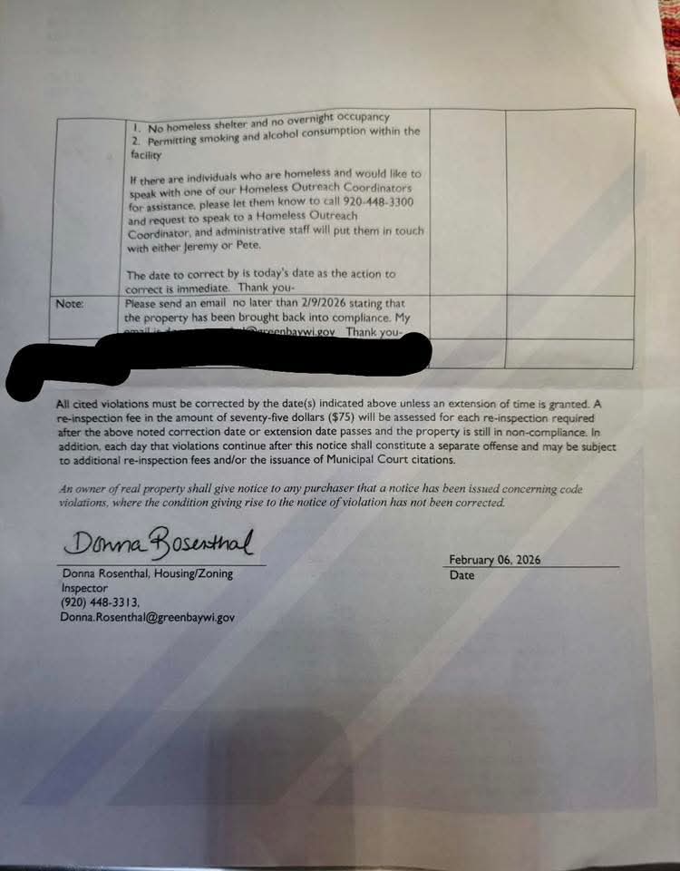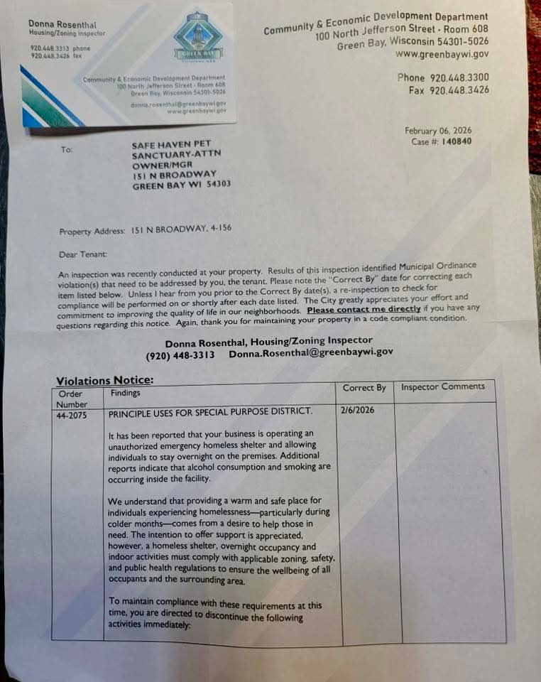 Notice given to Safe Haven by the City of Green Bay